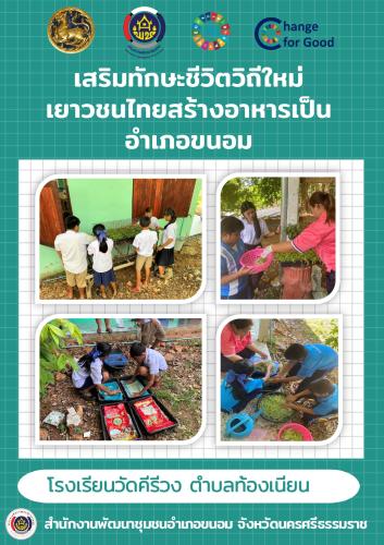 สำนักงานพัฒนาชุมชนอำเภอขนอม ได้ขัลเคลื่อนกิจกรรมเสริมทักษะชีวิตวิถีใหม่ เยาวชนสร้างอาหารเป็น โดยการรรรงคืส่งเสริมให้ศูนย์พัมนาเด็กเล็ก โรงเรียน เรียนรู้กิจกรรมสร้างความมั่นคงทางอาหาร